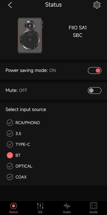 From the main tab you can check the current wireless audio codec (my smartphone for some reason went to SBC although LDAC is also available), enable/disable the power saving mode, mute the speakers and change the input.