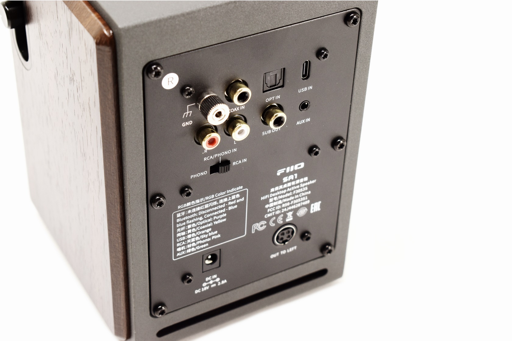 Right now the SA1 are available in two different color combinations (twilight black and cloud white - above picture) and feature 3.5-inch (90mm) wood fiber woofers (with 75mm flexible suspension for bass extension down to 65Hz - 20W output), 3/4-inch (20mm) aluminum magnesium alloy dome tweeters (5W output), 2-way active crossover (3.5kHz), TPA3118 class D digital audio amplifier, built-in phono preamp, volume and bass control knobs and an RGB ring on the volume knob which changes color according to input type (sky blue for RCA, pink for PHONO, Green for AUX, purple for Optical, yellow for Coaxial, orange for USB and blue for Bluetooth). Thanks to the 3.5-inch woofer & 3/4-inch tweeter the SA1 offer a frequency response of 65Hz-20KHz (Hi-Res certified) with 6 Ohm impedance and a total power output of 50W. FIIO has also placed an adjustable 31-band high precision lossless PEQ (via their control app) and as for available connectivity the SA1 offer both wired (stereo RCA, 3.5mm aux, USB 96k/32bit, coaxial 192k/24bit and optical 96k/24bit) and wireless (Bluetooth v5.4 with support for LDAC, AAC and SBC audio codecs).