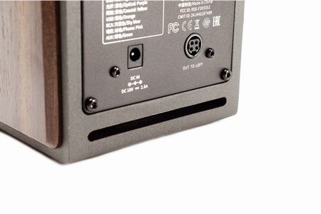 The two control knobs (volume/input and bass adjustment) and the power on/off and RGB on/off switch are placed on the right side of the primary speaker.