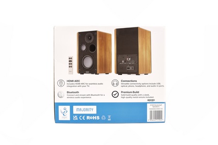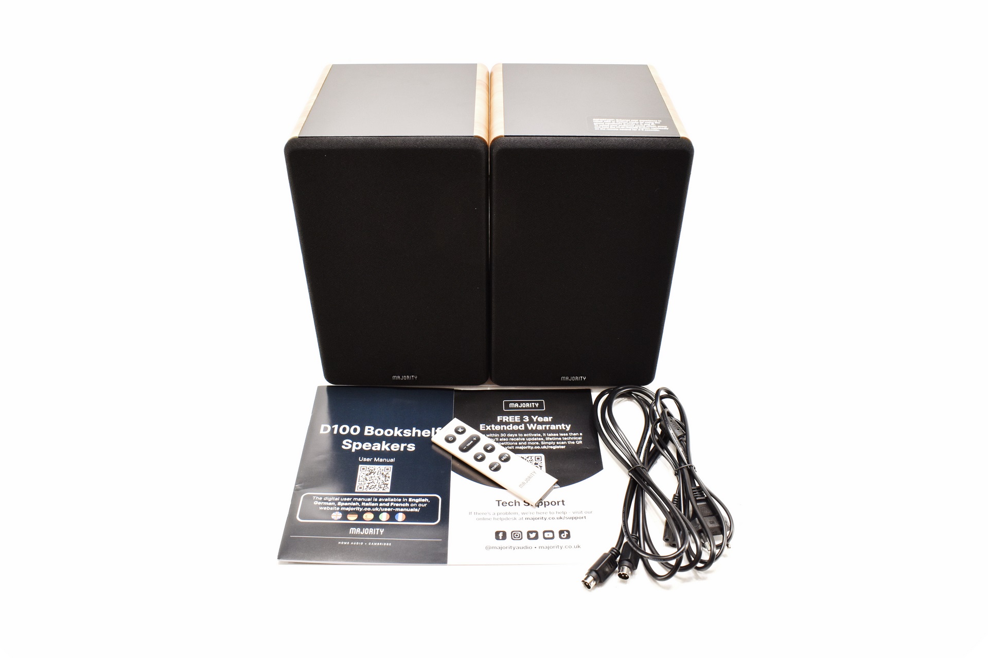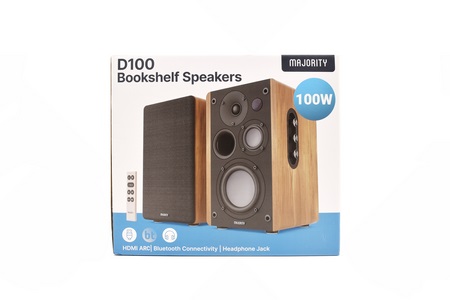 Along with the D100 Bookshelf speakers and their remote inside the box you'll also find the speaker connection cable, power cable, warranty paper and the user manual.