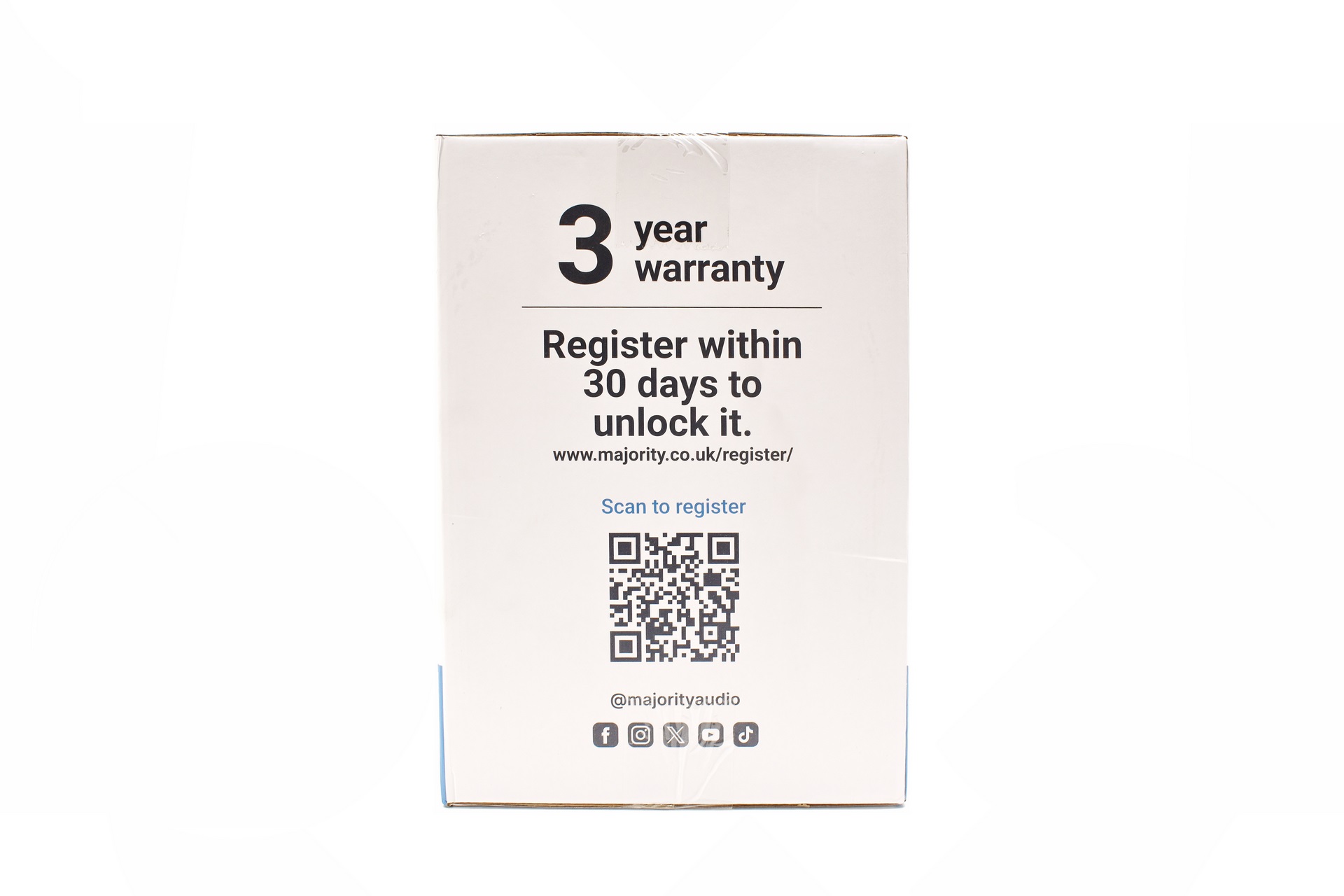 The 3-year warranty registration is showcased on the right side.