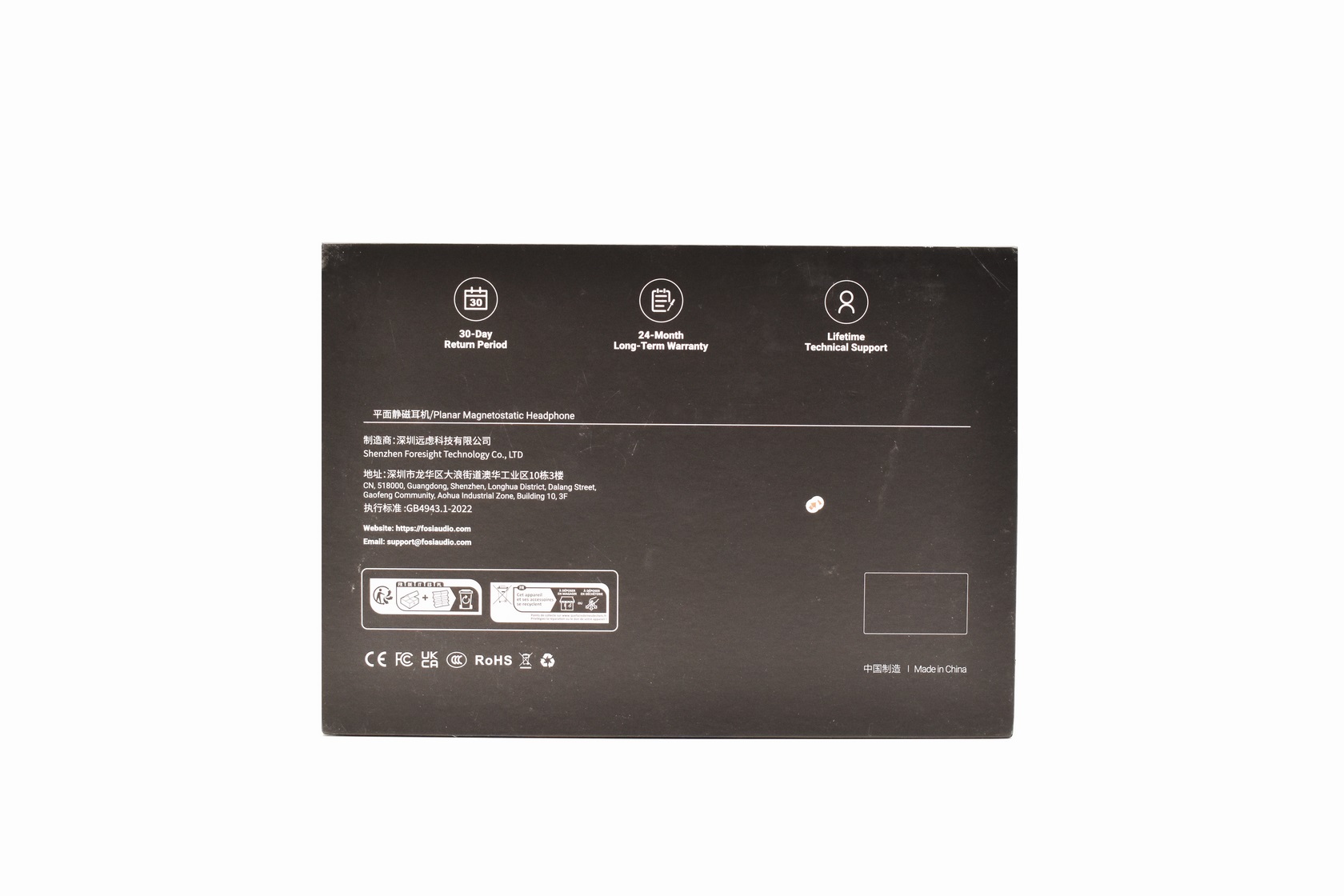 Contact information and things like the warranty period, return period and lifetime product support are printed at the rear.