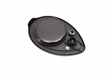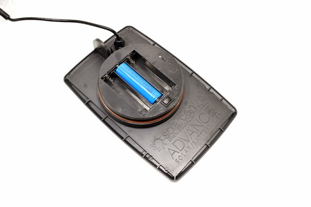At the rear we find an activity LED, battery compartment, connection cable and the wall stand mount.