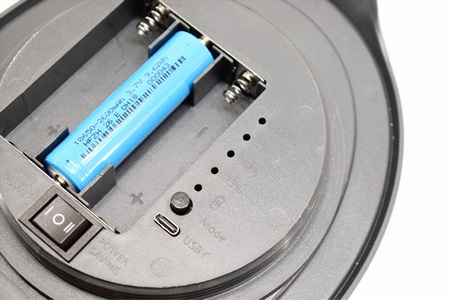 Underneath we find the battery compartment inside which there's the on/off button, USB-C charging port, charging LED, 2200mAh 18650 lithium-ion battery (can add 2 more) and the wall stand mount.