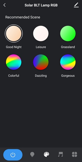 The initial screen allows you to check the battery life and select color for the bulbs from the round palette (strangely enough the Advance can't reproduce white color).