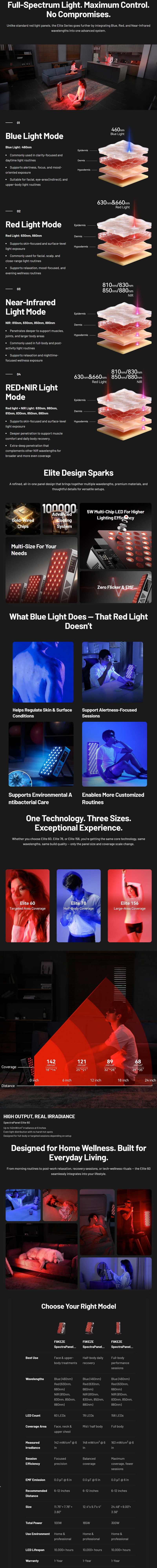 The SpectraPanel Elite 60 is a compact, multi‑wavelength light‑therapy panel built around a 60‑LED array that blends blue, red, and near‑infrared output in a single unit. More specifically it uses 460nm blue, 630nm and 660nm red, and 810nm, 830nm, 850nm, and 880nm near‑infrared wavelengths, giving it a broad spectrum intended for skin‑level and deeper‑tissue applications. It also features an irradiance of 142mW/cm² at 6 inches (15cm), positioning it as a high‑intensity option for close‑range sessions, even light distribution, low EMF readings at typical use distances, and a build designed for face and upper‑body treatments. It also comes with a 12‑month warranty, a 14‑day return policy, and a design that emphasizes portability while still offering a multi‑wavelength configuration usually found in larger panels. All of these details frame the SpectraPanel Elite 60 as a versatile, small‑format device aimed at users who want a broad spectrum of therapeutic light without committing to a full‑size system.
