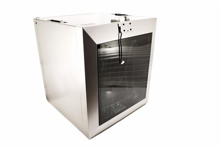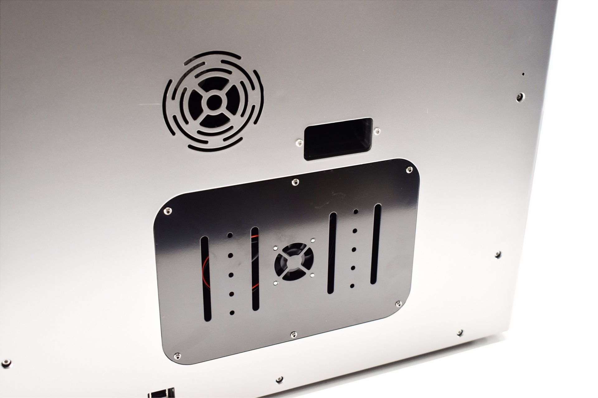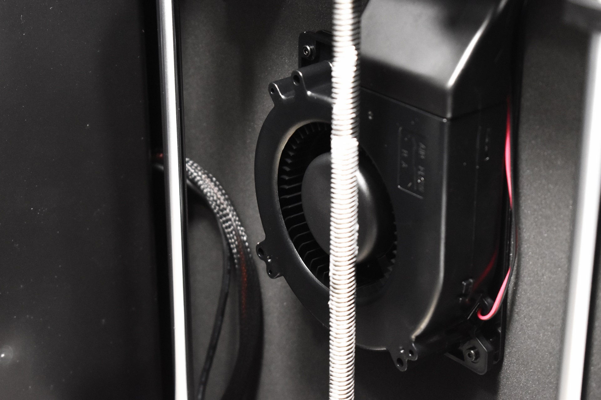Two blower type fans are placed on the interior of the enclosure.