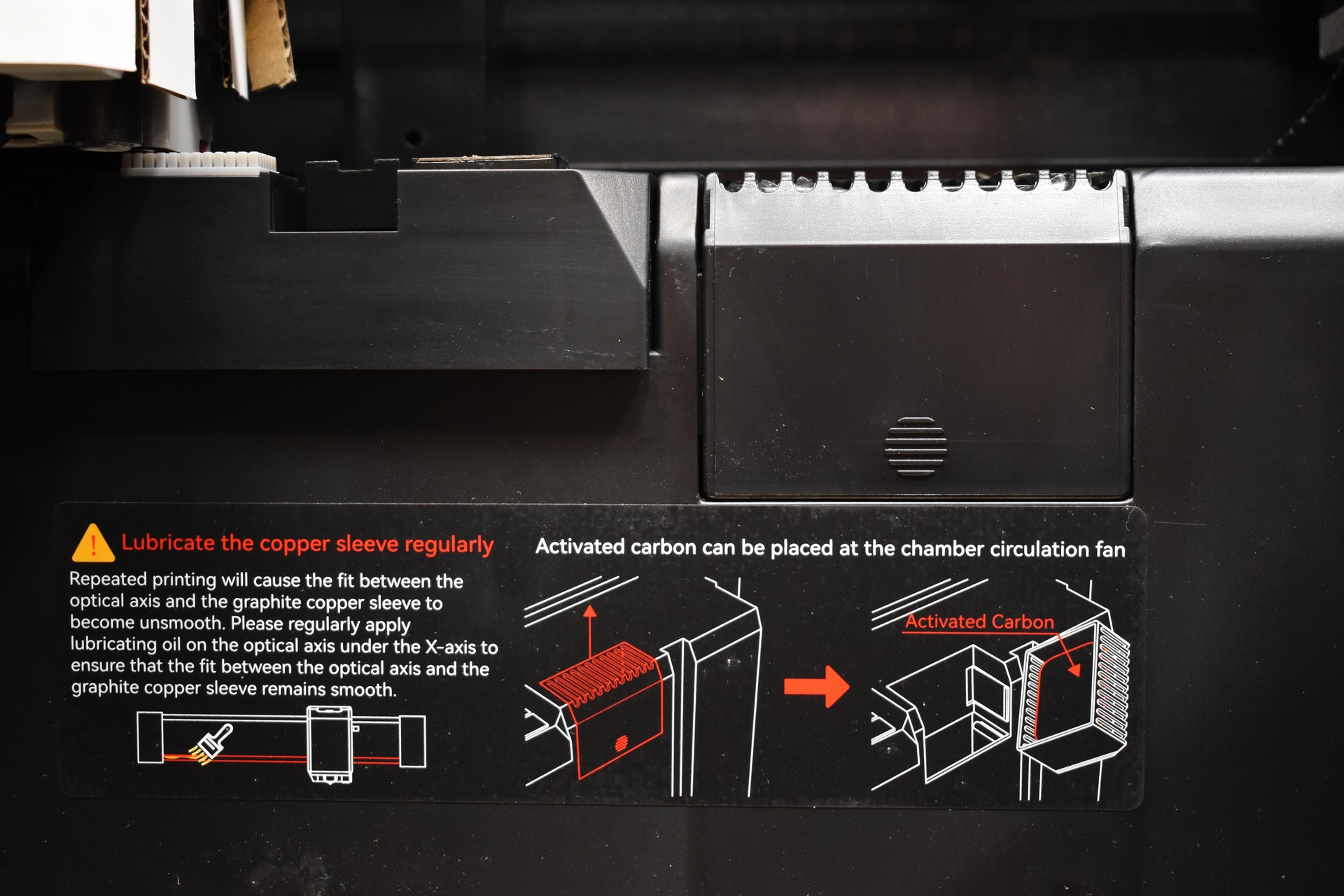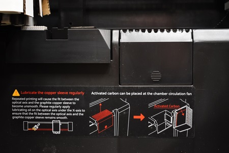 There’s also a nozzle cleaner, filament collector and an activated carbon compartment with an activated carbon pouch/bag inside.