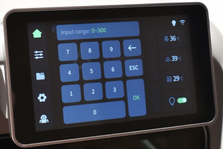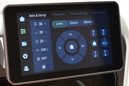 From the main tab you can check and adjust current temperatures (printing platform, enclosure and extruder), turn the LED light on/off, access local files (built-in memory and USB) and see what filaments are installed (only after you complete that step).