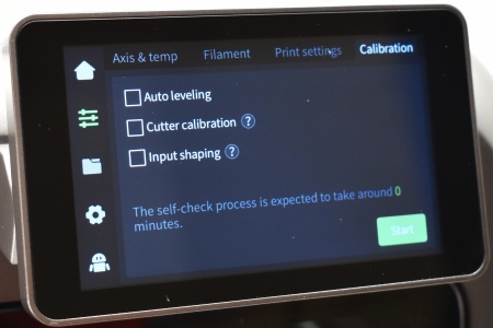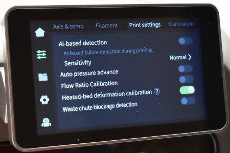 Second tab gives you control over the axis, temperatures and print plate, allows you to load/unload filaments (easy to do with RFID, just press the loading circle on top of each filament position), adjust print settings like AI detection and perform calibration (auto leveling, cutter calibration and input shaping).