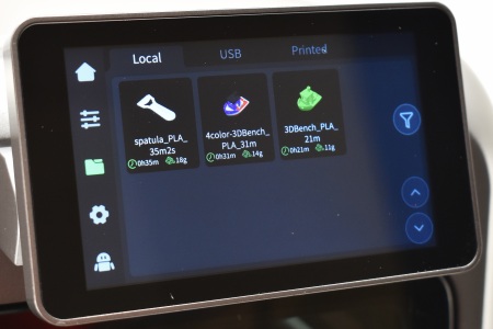 Third tab list 3D model thumbs found in the built-in memory (if you print something from the USB it first gets copied to the local memory) and the USB (also records what prints you’ve completed).
