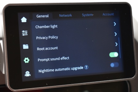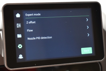 From inside the settings tab, you can adjust the brightness levels of the LCD touchscreen, set sleep time for the screen, change the language, enable/disable timelapse, enable/disable sounds, enable/disable automatic firmware updates during the night, access expert mode settings, check for updates and reset the printer to its factory settings.