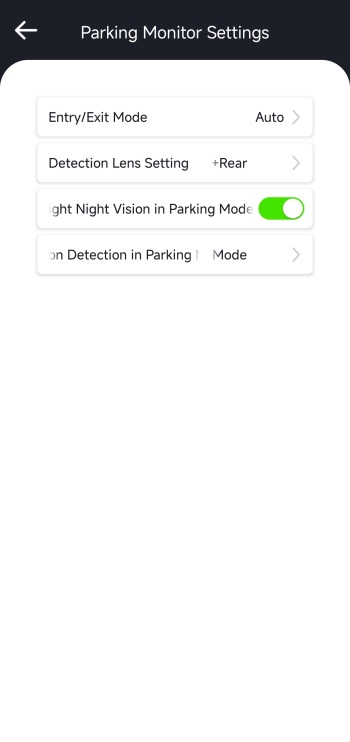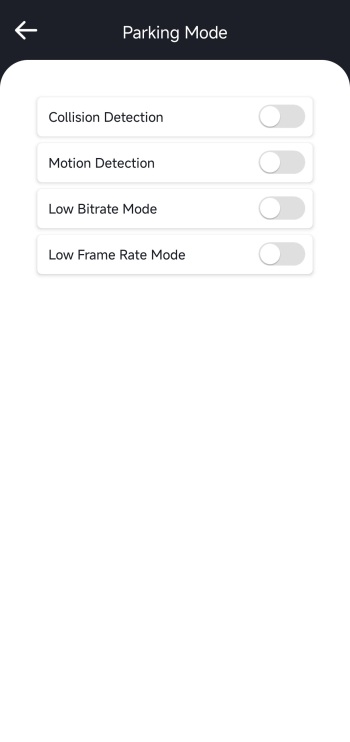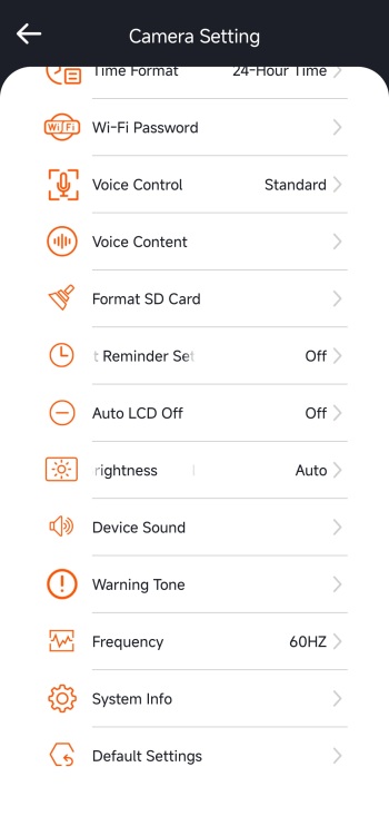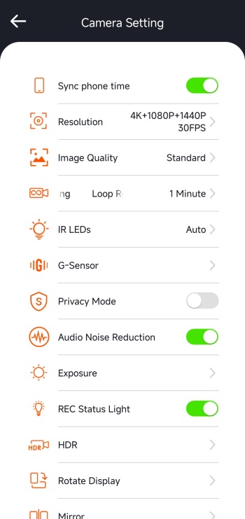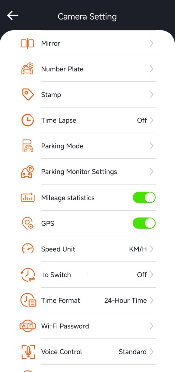 Inside the camera settings tab you can sync phone time to the N4 Pro S, change resolution for all 3 cameras, switch image quality between standard and PlatePix, adjust loop recording length, adjust the IR LEDs and G-Sensor, enable/disable privacy mode and audio noise reduction, set exposure, enable/disable HDR (enabled by default), rotate and mirror the display, enable/disable timelapse and parking mode, set parking mode settings, enable/disable mileage statistics and GPS, set the speed unit, change the Wi-Fi password, adjust voice features, format the microSD card, adjust brightness, set the frequency and more.