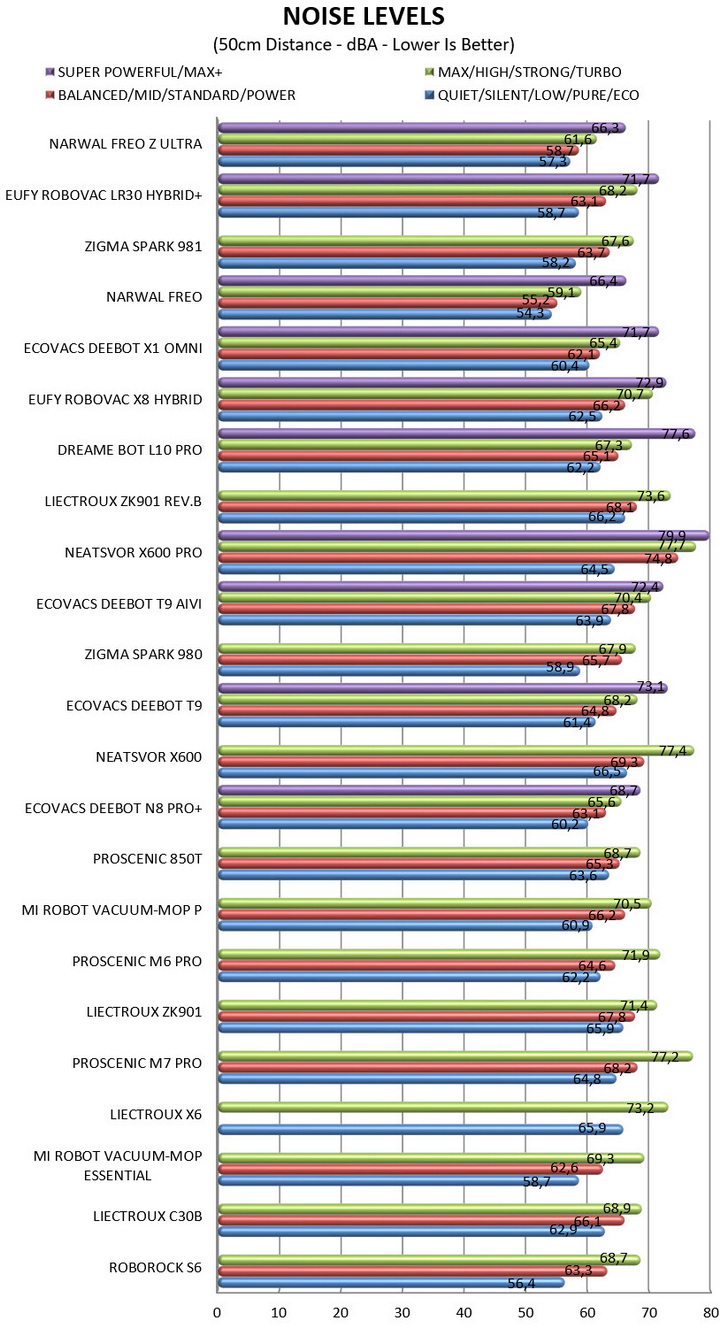 Robot Vacuums may be home appliances but they are very advanced ones so I thought about running some tests like I do with most electronic devices. So here you can see the maximum cleaned area during all tests (single pass, start to finish), total battery life (in quiet - standard/balanced - strong/max and super strong/max+ modes) and noise levels (again in quiet - standard/balanced - strong/max – super strong/max+ suction modes).