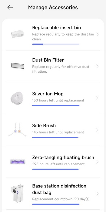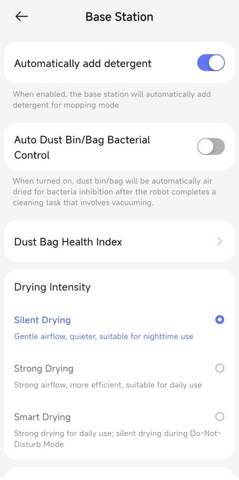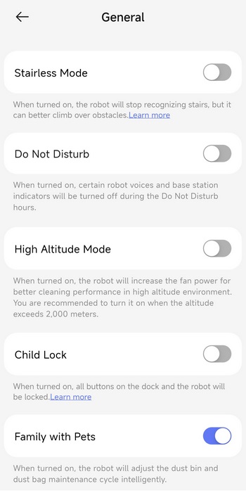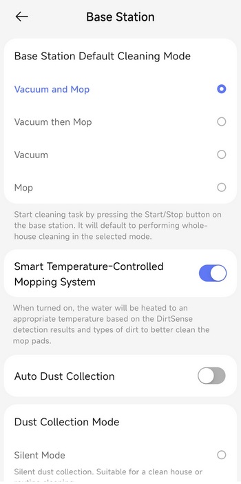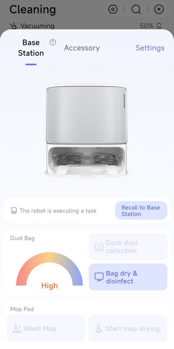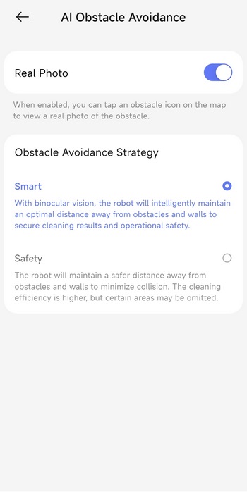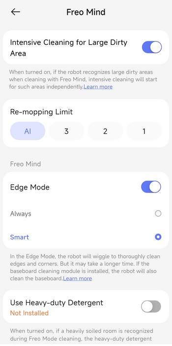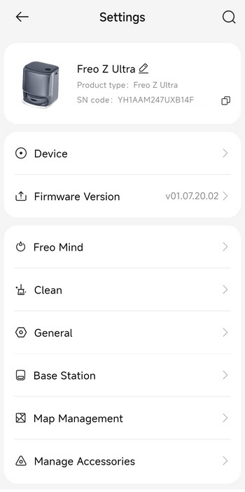 Via the settings tab you can check for firmware updates, adjust the Freo mind cleaning settings, enable/disable several cleaning modes, adjust base station settings, manage your maps and accessories, change the voice language, enable AI obstacle avoidance with pictures and enable voice control integration with Amazon Alexa and Google Home.
