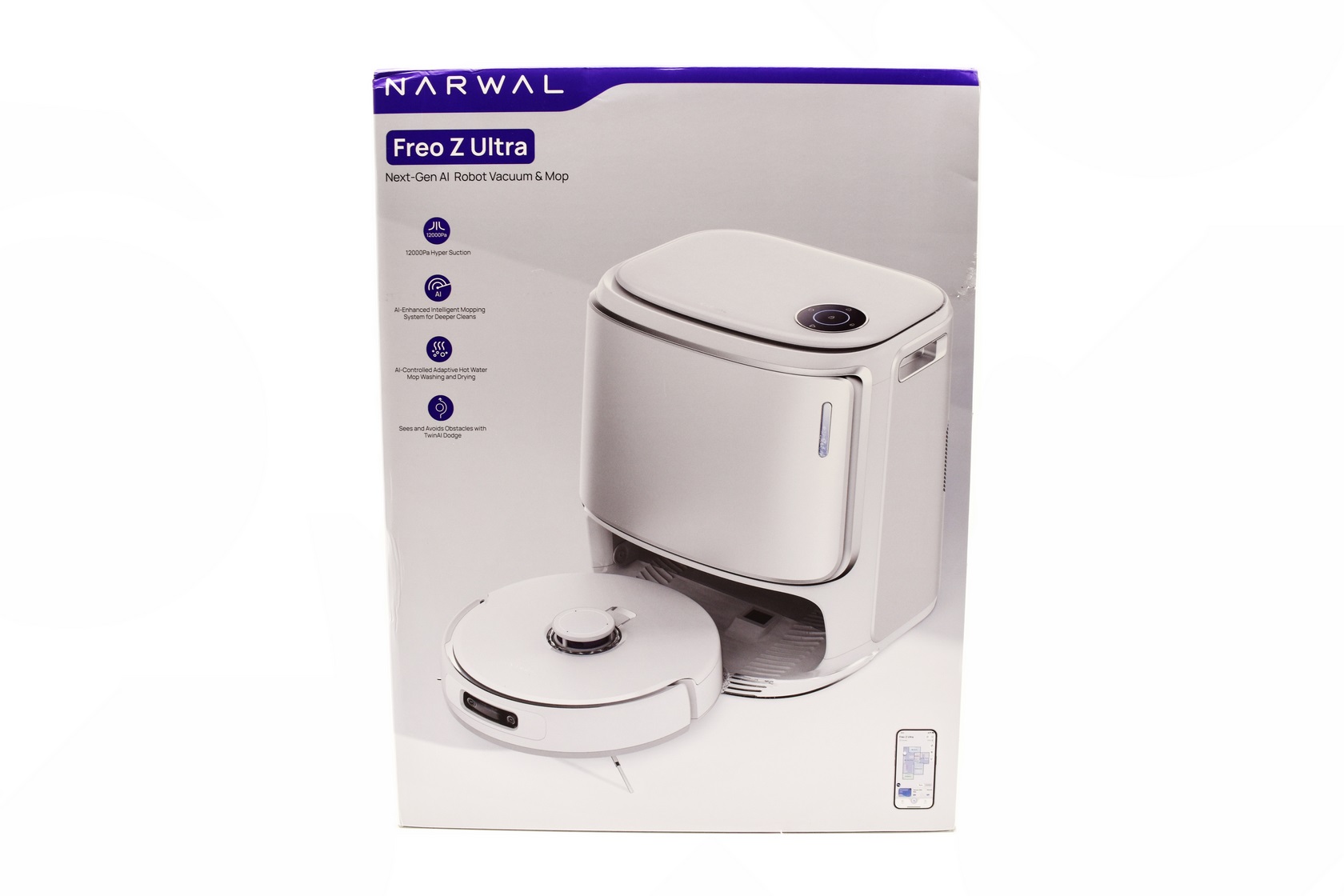 Just like its predecessor the latest Freo Z Ultra Next-Gen AI Robot Vacuum & Mop by Narwal (currently available in white and silver and grey and silver colors) uses 360 degrees LiDAR navigation (4.0 version) which this time is also paired with dual RGB cameras (1600x1200p with 136 degrees ultra-wide angle) complete with 5 LED headlights and two AI chips which determine how the robot moves and cleans your house (complete with real time object avoidance, dirtsense mode and weather adaptive cleaning). The Freo Z Ultra is also equipped with a brushless motor that sports a suction power of 12000Pa, 360 degrees sensors (anti-fall/edge cleaning/light edge), dual height adjustable triangular shaped mopping pads (spin at 180RPM, deliver up to 12N/11.2Kg scrabbing pressure and retract - 12mm - when the robot is not in mop mode), 500ml dustbin, 2 side brushes, baseboard cleaner, floating detangling roller brush and a 5200mAh lithium-ion rechargeable battery pack which should keep the Freo Z Ultra going for up to 3 and 1/2 hours. The base station this time over is not only for charging, providing fresh water (with electrolysis - 5L clean water tank, 4.5L dirty water tank) and washing and drying the mopping pads when needed (drying heat of up to 75 degrees Celsius for complete sterilization), it also has a 2.5L dust bag which can last up to 120 days thanks to dirt compression. There's also a round LCD touch display on top of the base station from where you can control the main functions of the robot if using the smartphone app is not ideal for you (or if you don't have your smartphone near you). Once again, the Narwal app allows the end user to control modes, schedule cleaning, customize cleaning routines, manage accessories, generate cleaning reports, rename rooms, set no-go zones and much more. The latest flagship model by Narwal seems to be many steps over first Freo model so let's see just how good it really is.