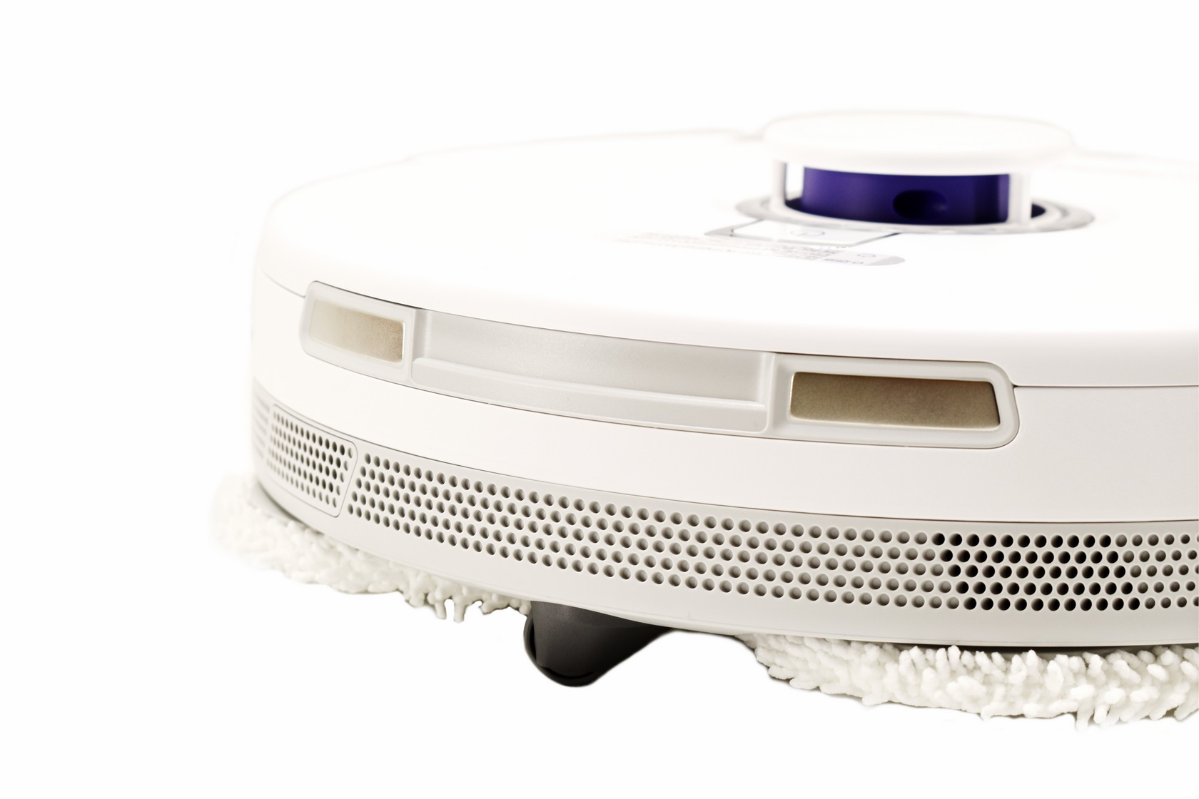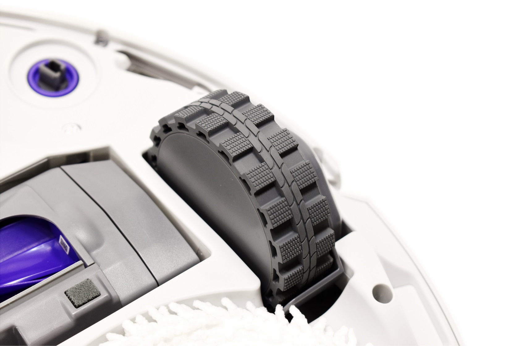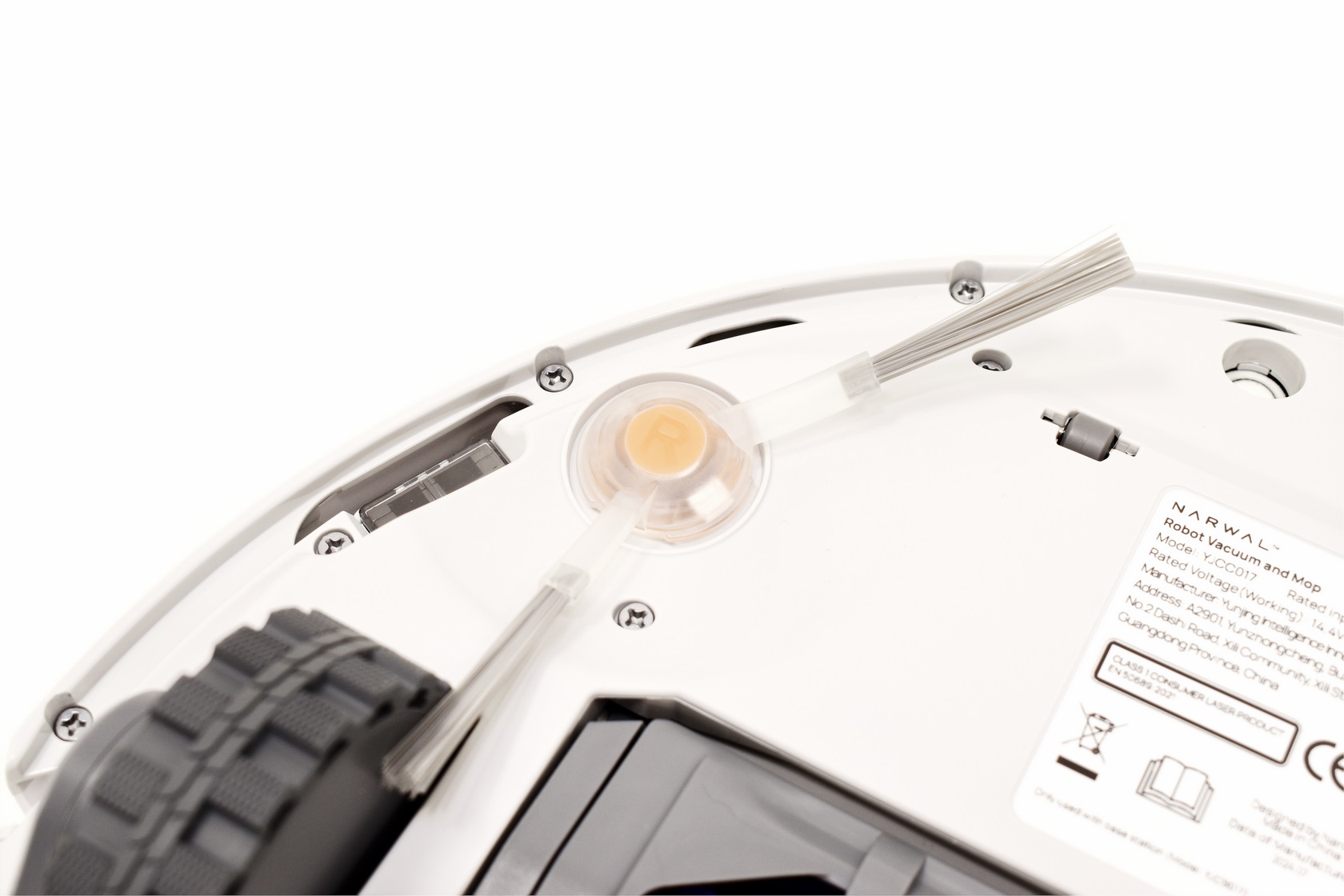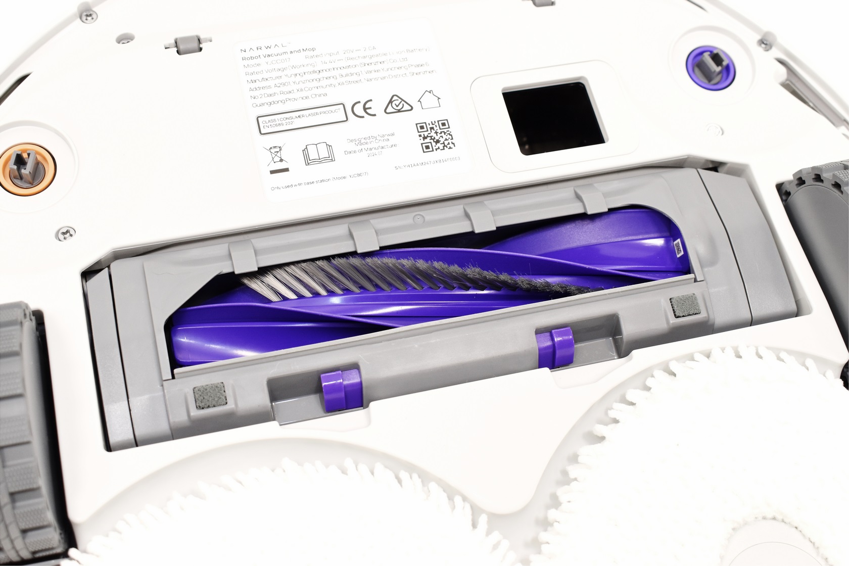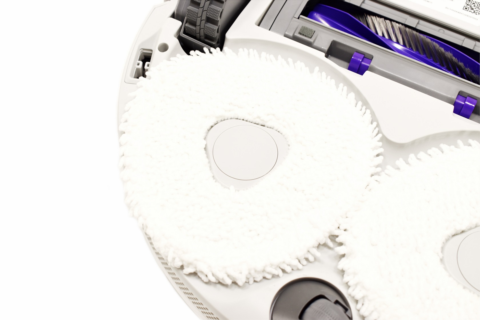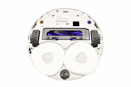 Turning the Freo Z Ultra over we see the two rubberized side wheels, two triangular shaped mopping pads, floating detangling roller brush, two ports for the side brushes, 3 sensors and the baseboard slot.