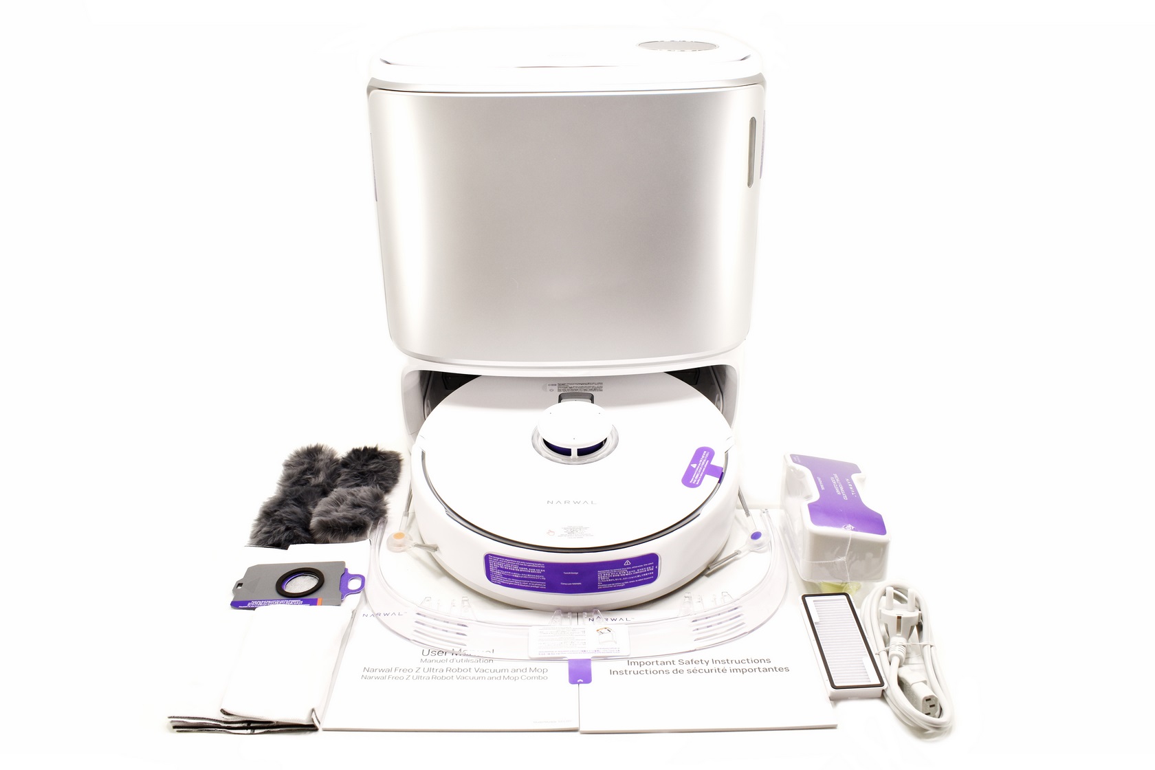 Along with the Freo Z Ultra robot vacuum and its base station with its power cord inside the box you'll also find the two side brushes, baseboard cleaner, air filter, dustbin bag, plastic dustbin, floor cleaning solution, clear plastic base attachment, important safety instructions book and the user manual.