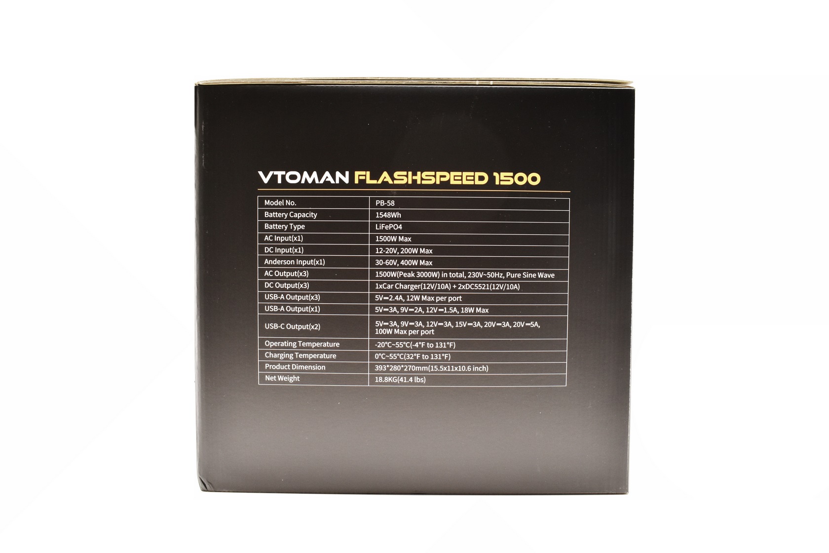 The specifications table is printed on the left side of the box.