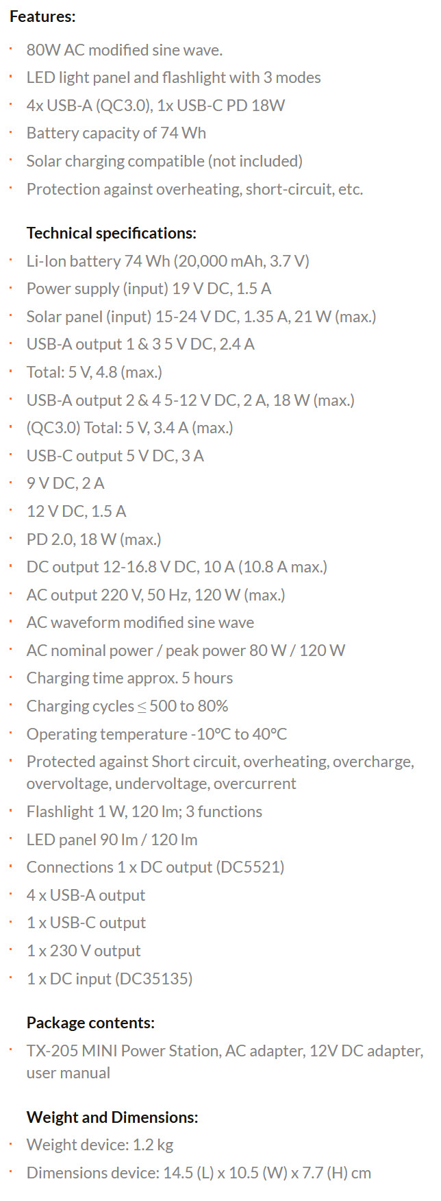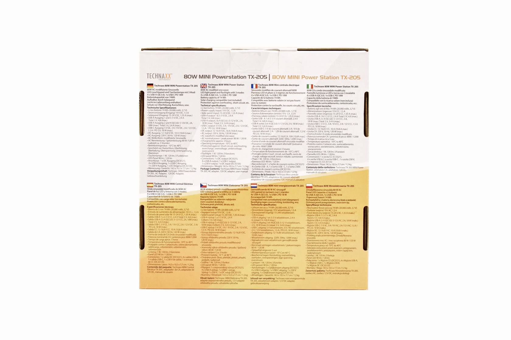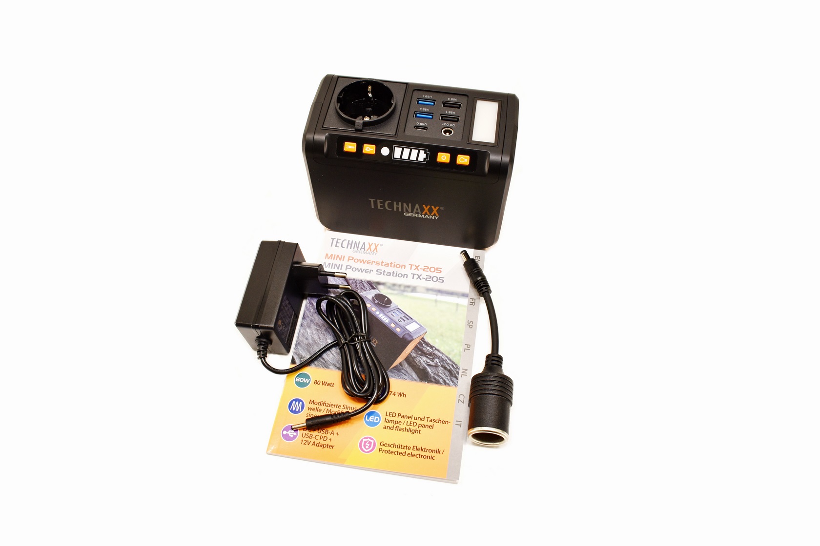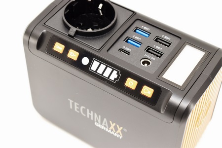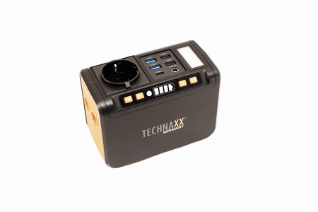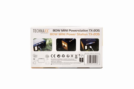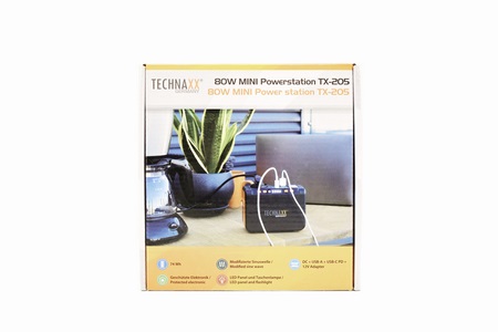 The TX-205 is a modified sinewave mini power station by Technaxx that supports a maximum supported power output of 80W (120W peak) and sports a lithium-ion battery capacity of 74Wh/20.000mAh complete with numerous electrical protections (short circuit, overheating, overcharge, overvoltage, undervoltage, overcurrent). It also features a tiny LED panel (90/120 lumen), single power socket, dual LED torch (1W/120 Lumen), 4 USB-A charging ports (2x5V/2.4A, 2x5-12V/2A 18W), USB-C charging port (5V/3A - 9V/2A - 12V/1.5A - PD 2.0 18W) and a DC output (12-16.8V/10A) complete with an car lighter adapter.