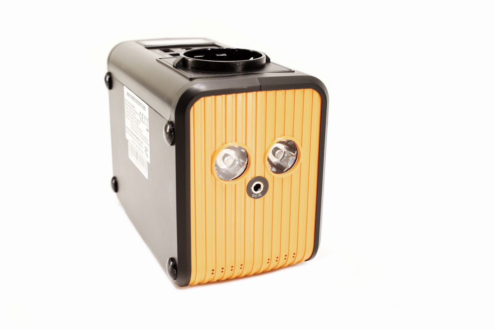 At the front we find 4 buttons (LED torch on/off/mode, AC on/off, on/off power button, LED panel on/off/brightness) and a battery level indicator between them.