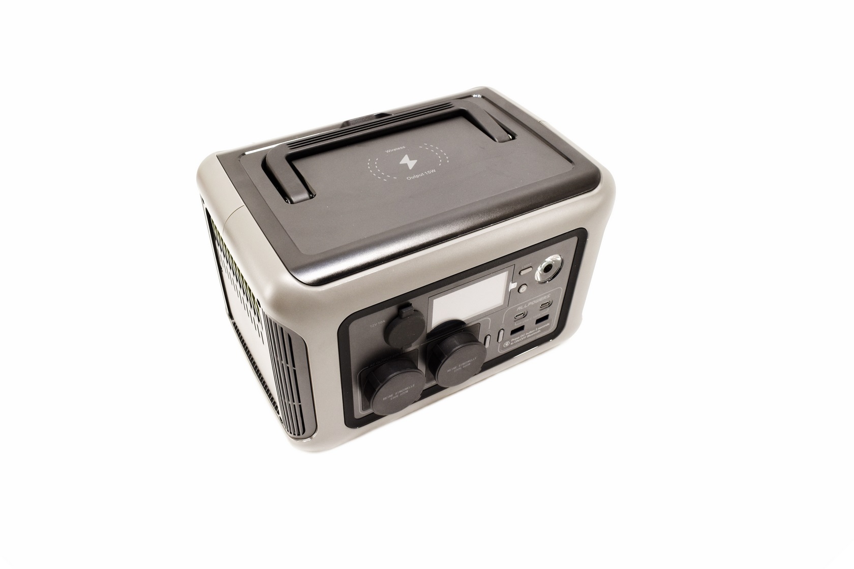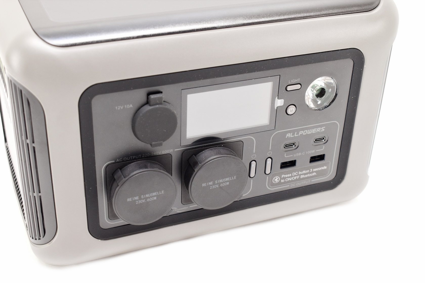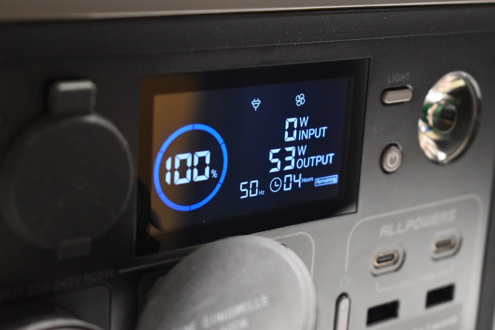All outputs are placed at the front of the power station so from left to right we have the 12V DC cigarette port, two AC ports with their on/off button, two USB-C and two USB-A ports with their on/off button, on/off power button, light mode button and the LED torch.