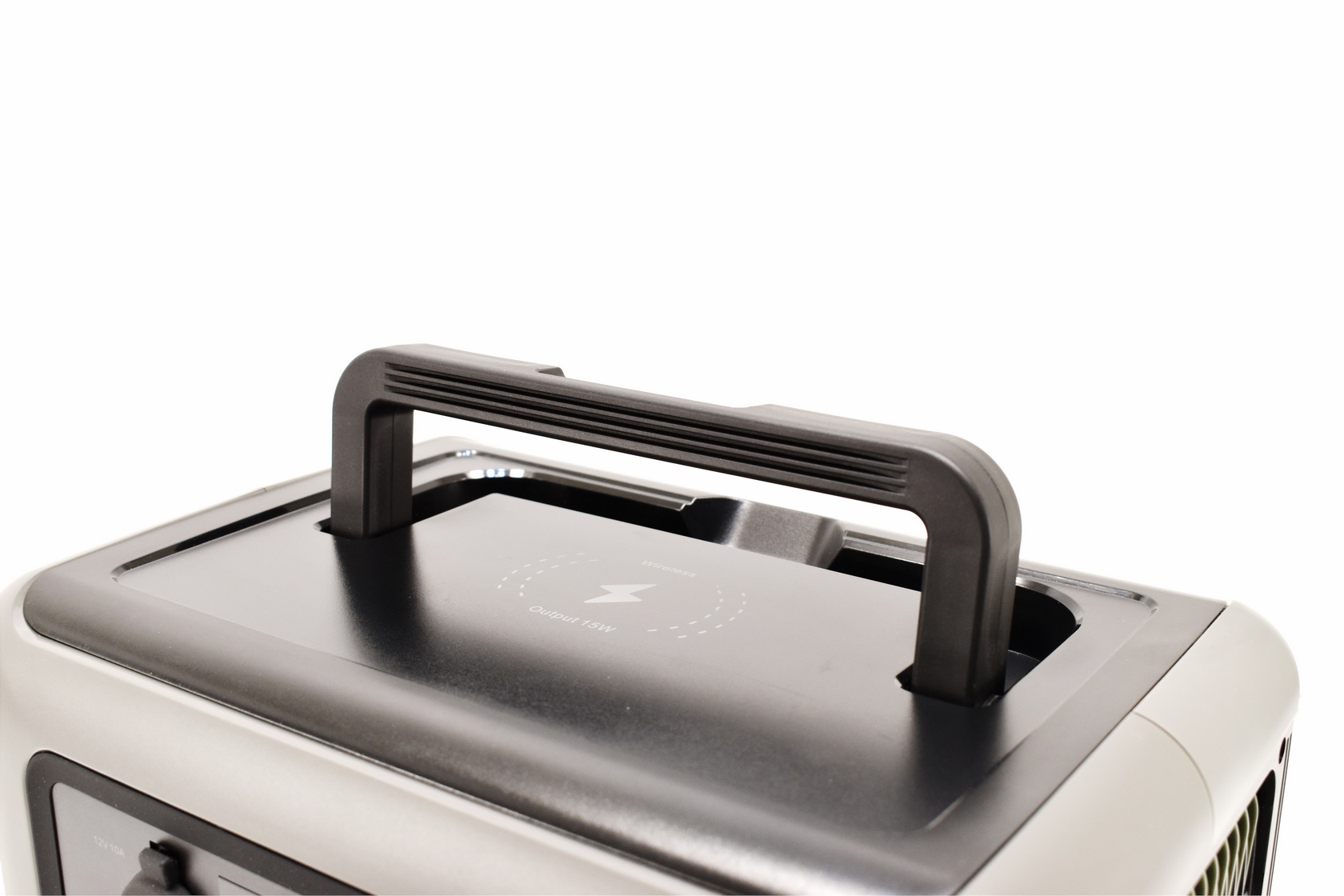 At the top we find the wireless charging area and a convenient plastic handle.