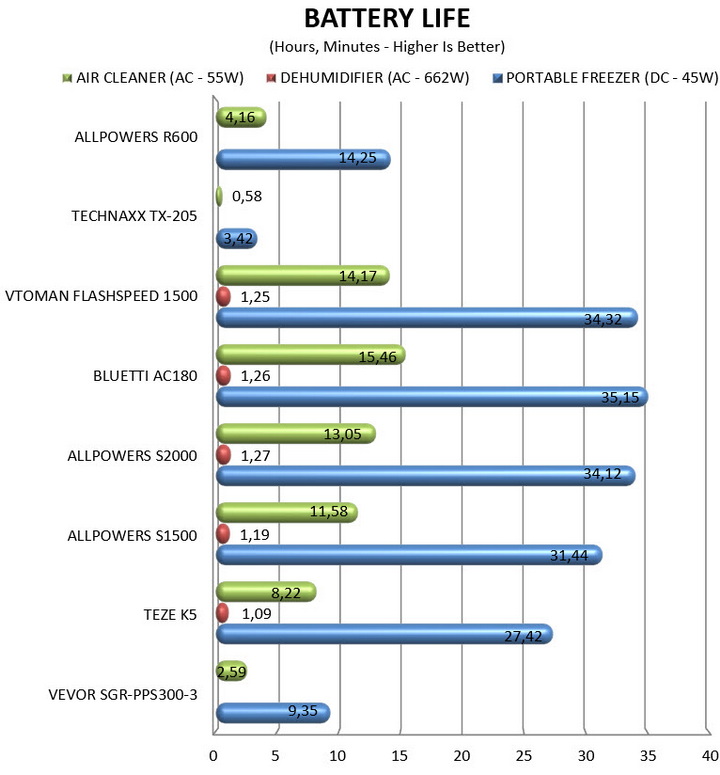 The R600 is the 3rd smallest portable power station I've received in the lab/office and well, it can't be really compared with the larger models, not just in terms of battery capacity but also power output. So, if you're looking for a power station capable of powering devices surpassing 300-400W for a significant amount of time the R600 model is simply not capable of that. On the other hand, the R600 is a great alternative to regular power banks since it easily surpasses most not only in battery capacity and power output but also available connectors (AC & DC support). On top of these you can also use a small solar panel to recharge the R600 when outdoors so if size (and occasional noise) is of no concern, it's the perfect replacement for large power banks. As for noise levels my sample was inaudible most of the time during testing, both while charging and while giving power to other devices. I only recorded noise a couple of times when things were getting very hot but again, for very short periods of time. I am pointing this out because Allpowers has made changes to the R600 lately and the speed profile of the internal fan seems to be among those changes.