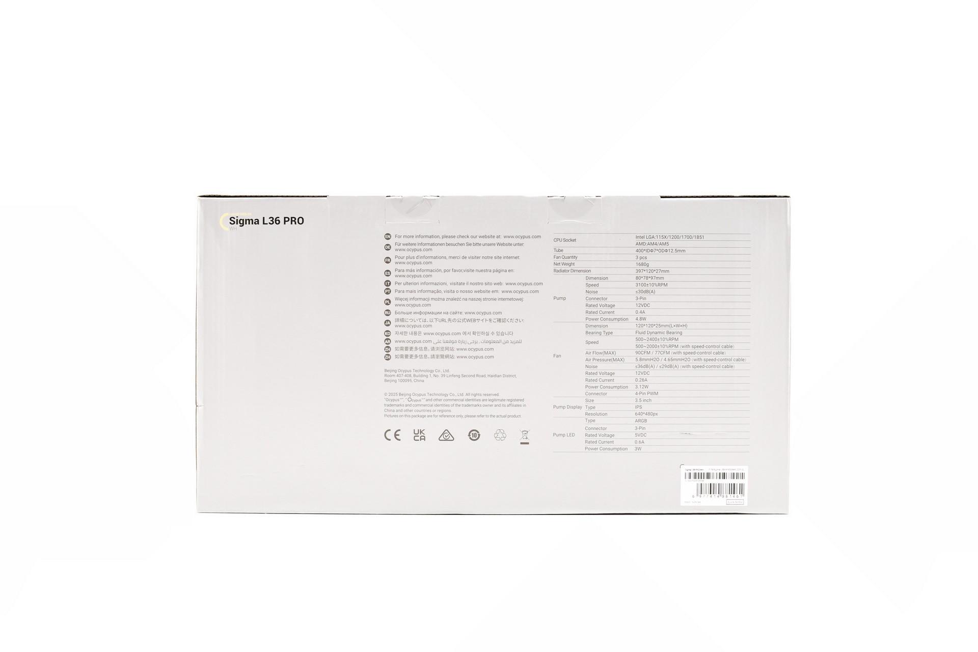 Ocypus ships the Sigma L36 Pro inside a silver box the front of which is taken by a large product picture and their logo.