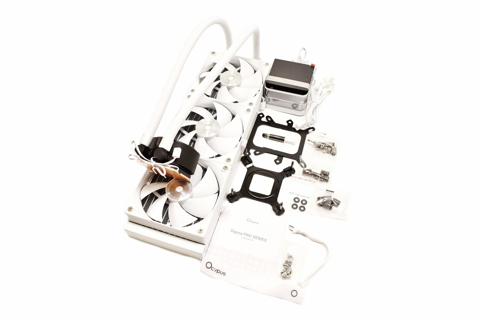 Along with the Sigma L36 Pro and its three 120mm fans (pre-mounted) inside the box you'll also find the magnetically attached IPS display, thermal paste tube, fan connection cable, small 3-pin extension cable, backplate and all the necessary bits to install the AIO onto LGA 1150/1151/1155/1200/1700/1851 and AMD AM4/AM5 motherboards.
