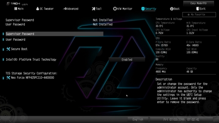The password and secure boot options are as always placed inside the security tab.