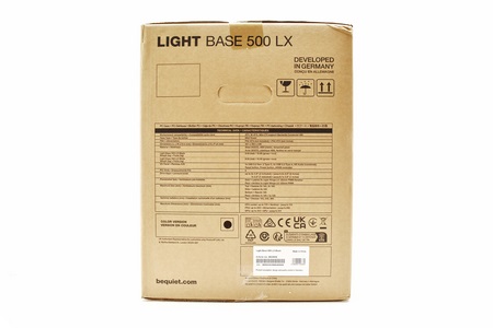 A few words about be quiet! in 3 languages are printed at the rear just over an exposed view of the 500 LX.