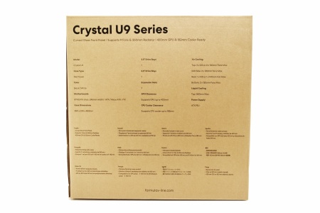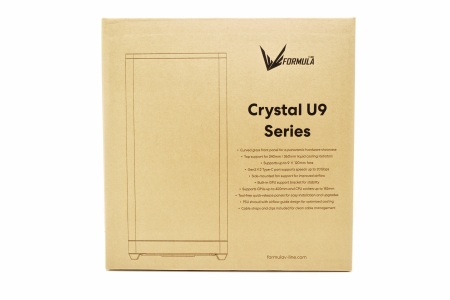 Formula V Line uses a plain cardboard box to ship the Crystal U9 PA the front of which has their logo, product drawing and the main product features.