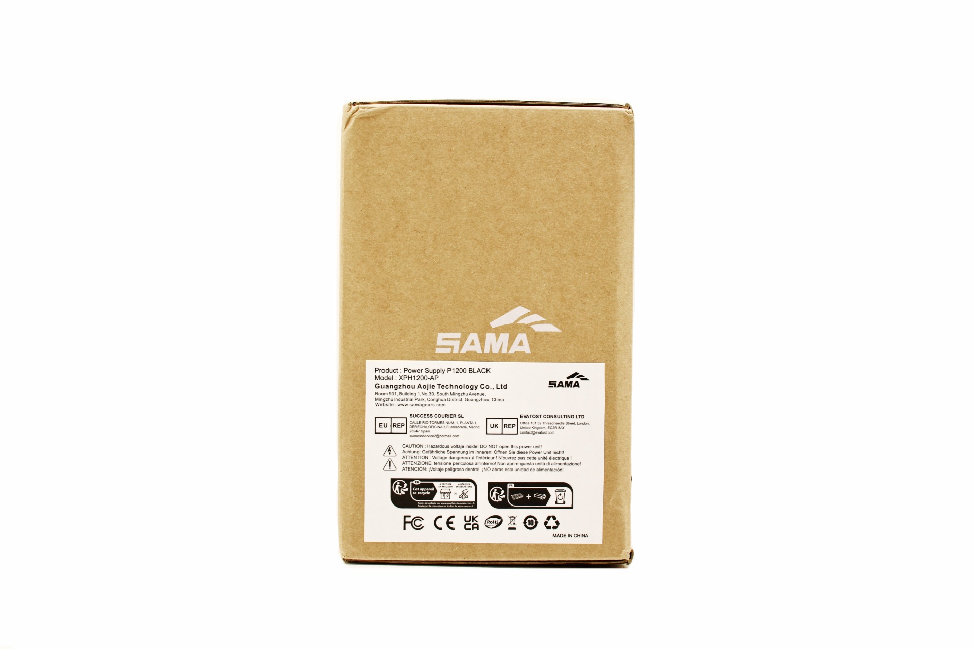SAMA uses a brown box to ship the P1200 the front of which is taken by their logo, product picture and several certifications.