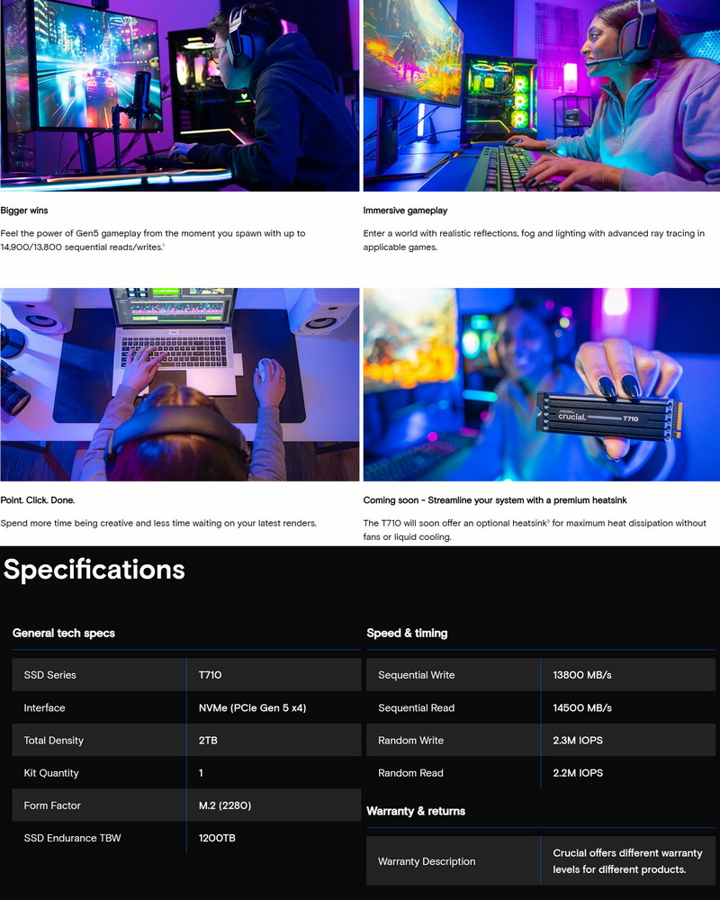 The brand new T710 line of M.2 Gen5 SSDs by Crucial is currently available in three capacities (1/2/4TB) and ships with or without a large black heatsink (according to marketing pictures it also has an RGB LED in it). For the T710 line Crucial has used the SM2508 NVMe 2.0 controller by Silicon Motion (6nm lithography) which they've paired with their very own (Micron) G9 276-layer 3D TLC NAND flash and 2GB of LPDDR4 DRAM (2133MHz/4266MT/s) for the 2TB model. The Silicon Motion SM2508 NVMe 2.0 controller features an quad-core ARM Cortex R8 CPU with support for 4 PCIe lanes of 32Gb/s data transfer speed (Gen5 x4), 8 NAND channels with a speed of up to 3600MT/s per channel and packs various technologies including end to end data path protection, programmable firmware interface, SRAM ECC & CRC parity, Innovative LDPC ECC engine, embedded programmable RAID, real-time full-drive AES 128/256bit encryption, hardware SHA 256/384 and TRNG, secure boot for FW authentication, built-in smart clock-gating mechanism (highly efficient power consumption), ONFI 5.0 and Toggle 5.0 support and TCG Opal 2.0 compliance. As for warranty Crucial covers the entire T710 line with a 5-year limited warranty and regarding endurance they report an TBW of 600 for the 1TB capacity, 1200 for the 2TB capacity and 2400 for the 4TB capacity.