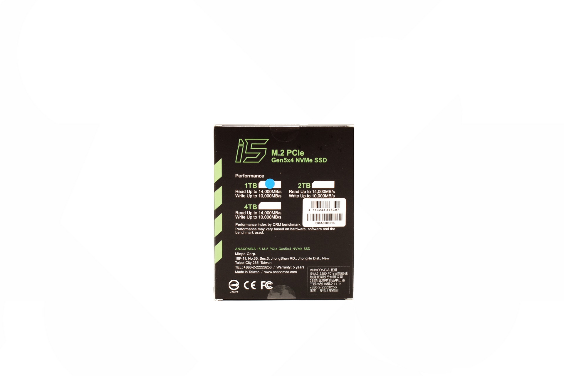 The i5 follows the typical 2280 form factor and has a sticker on top with the company name and logo.