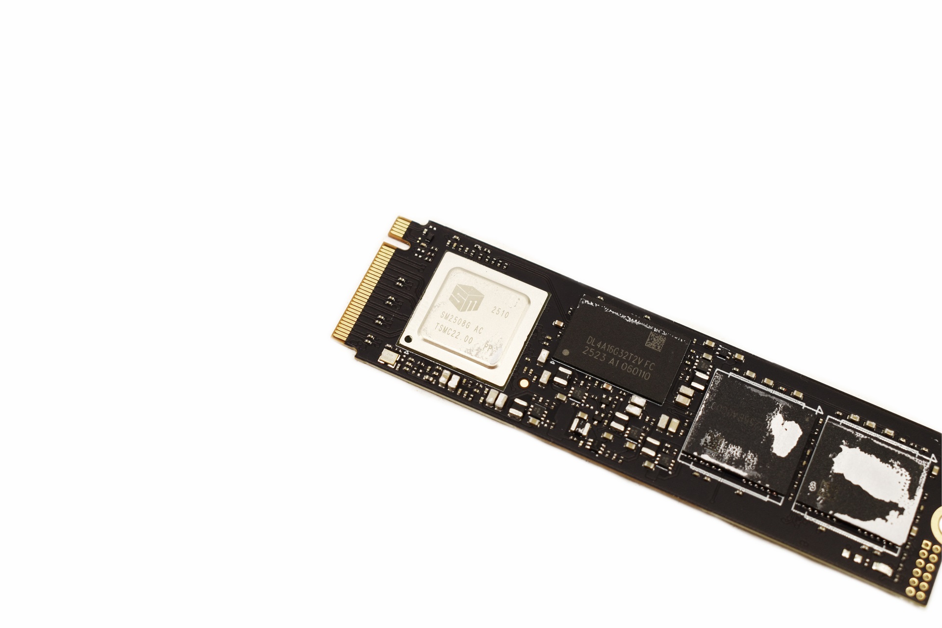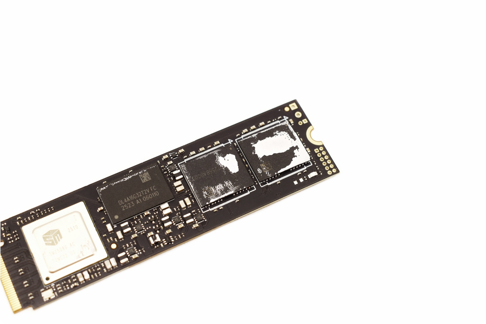 Under the sticker we find the Silicon Motion SM2508 NAND flash controller, Nanya 2GB LPDDR4 DRAM module and two Micron 232-layer 3D TLC NAND flash modules.