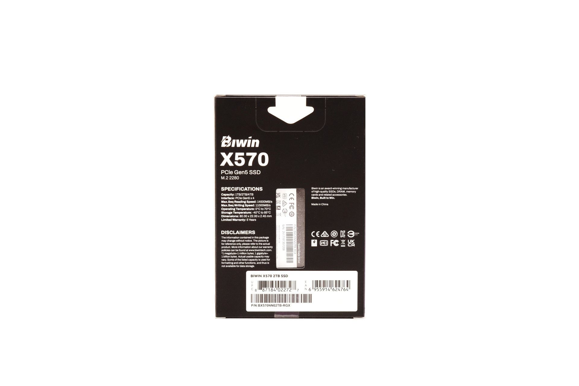 On the opposite side there's a sticker on which BIWIN has printed the model name, capacity, serial number and barcode and several certifications.