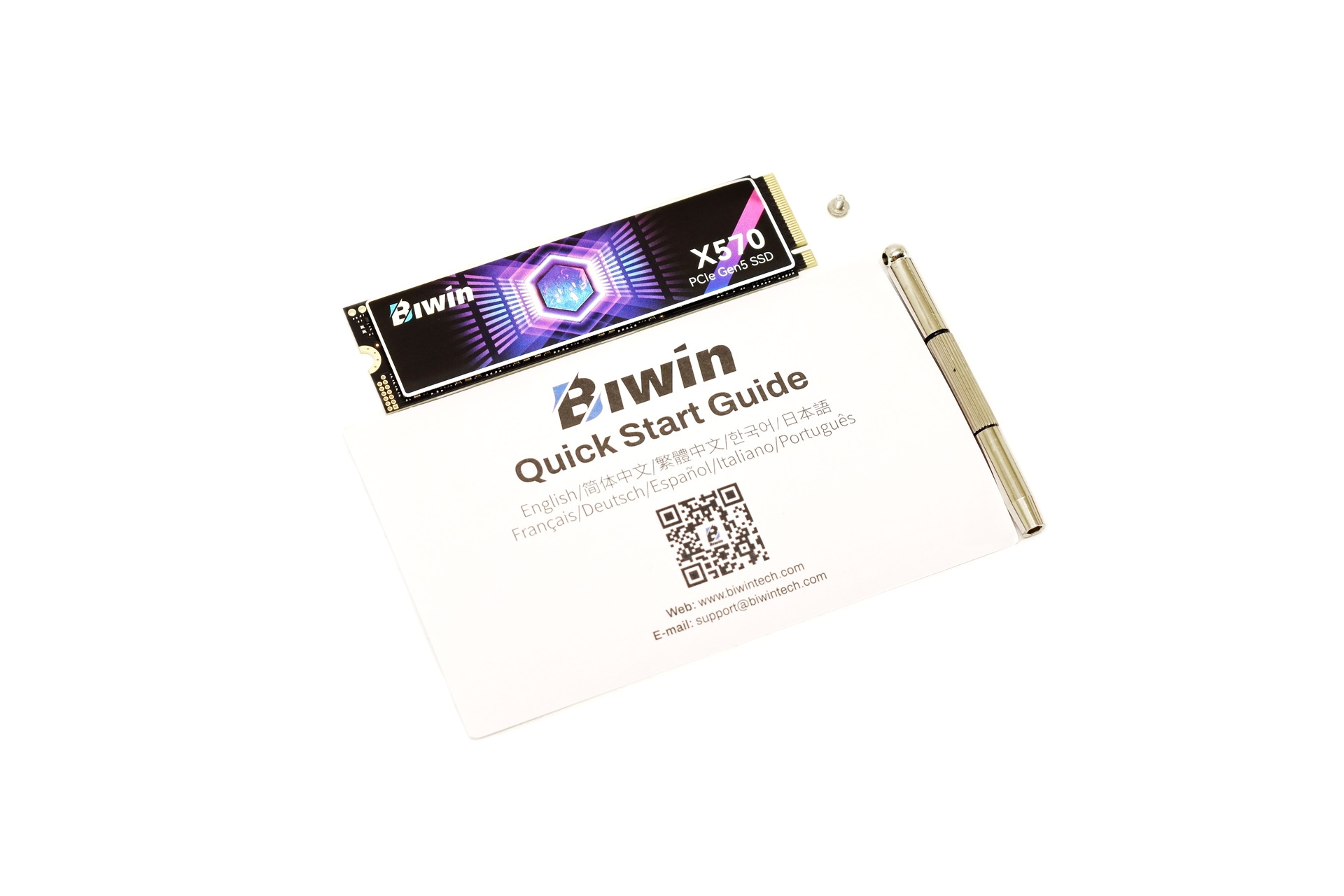 Inside the box you'll find the Black Opal X570 Gen5 SSD, secure tool, screw and the quick start guide.