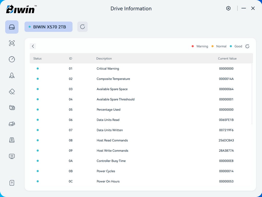 Drive health, temperature, information, and history are the things displayed on the main tab.