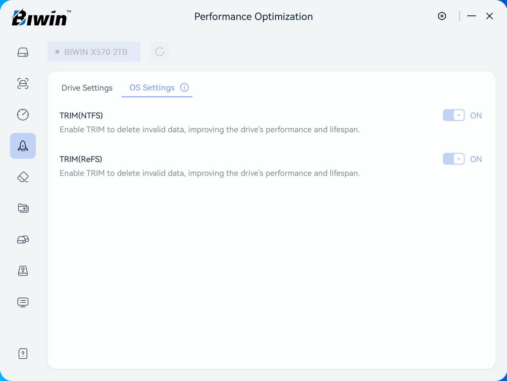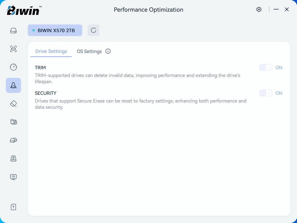 From the other tabs you can perform an error scan, run a performance test, enable/disable several features, erase the drive, migrate data, clone the drive, and perform a firmware update.