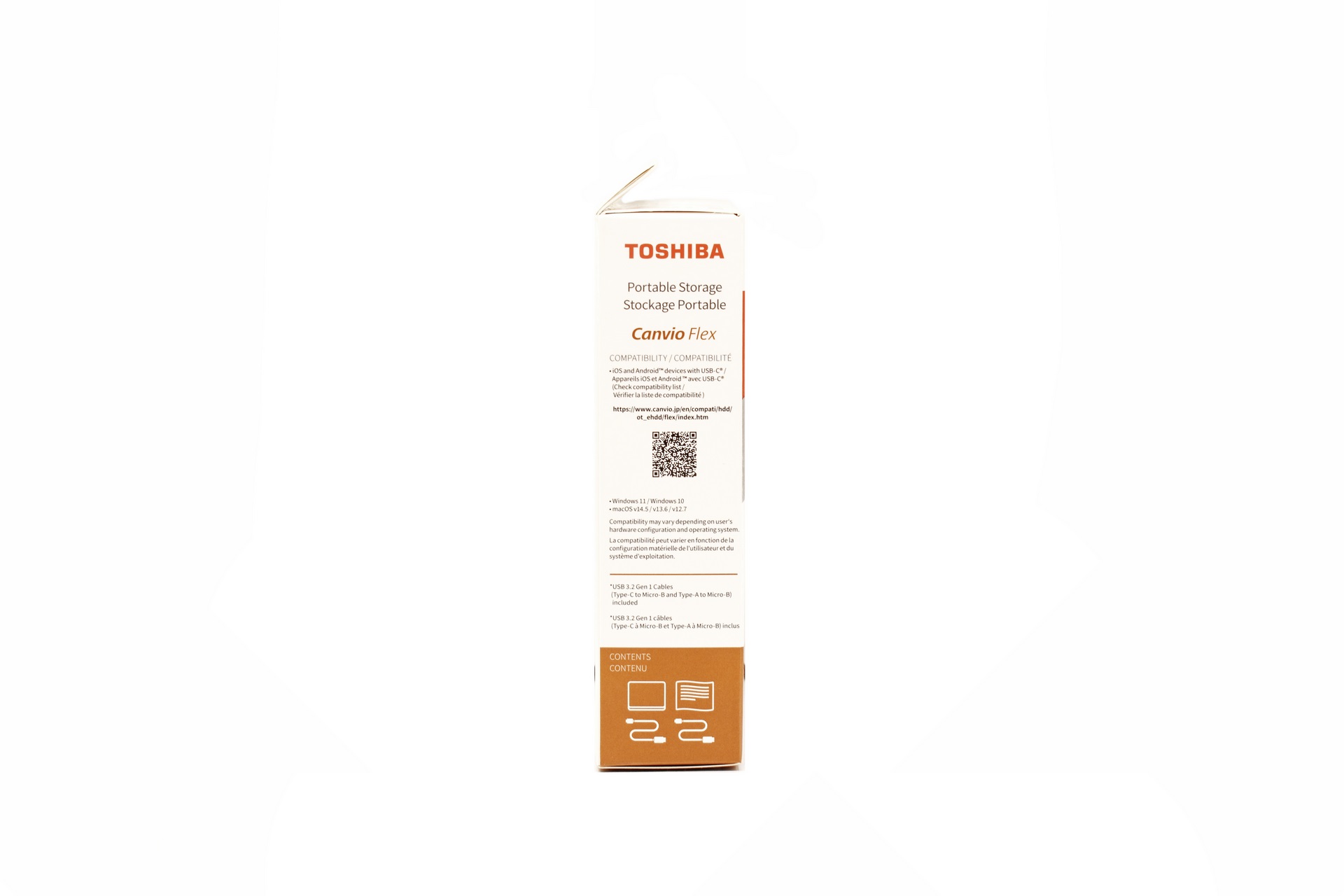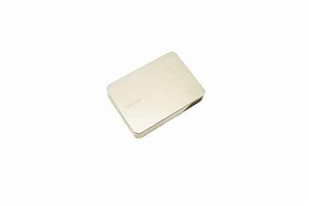 Toshiba uses a small white box at the front of which they've placed a product picture, their logo, capacity and connectivity.
