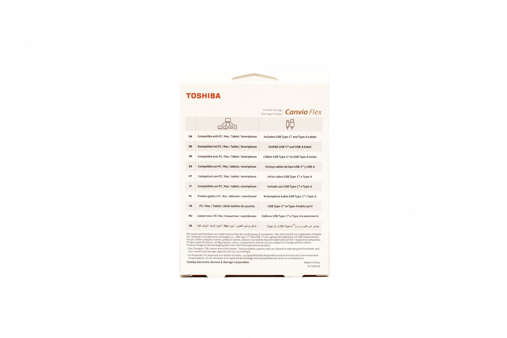 At the rear Toshiba also reports the OS compatibility and bundled cables, this time however in 10 languages.
