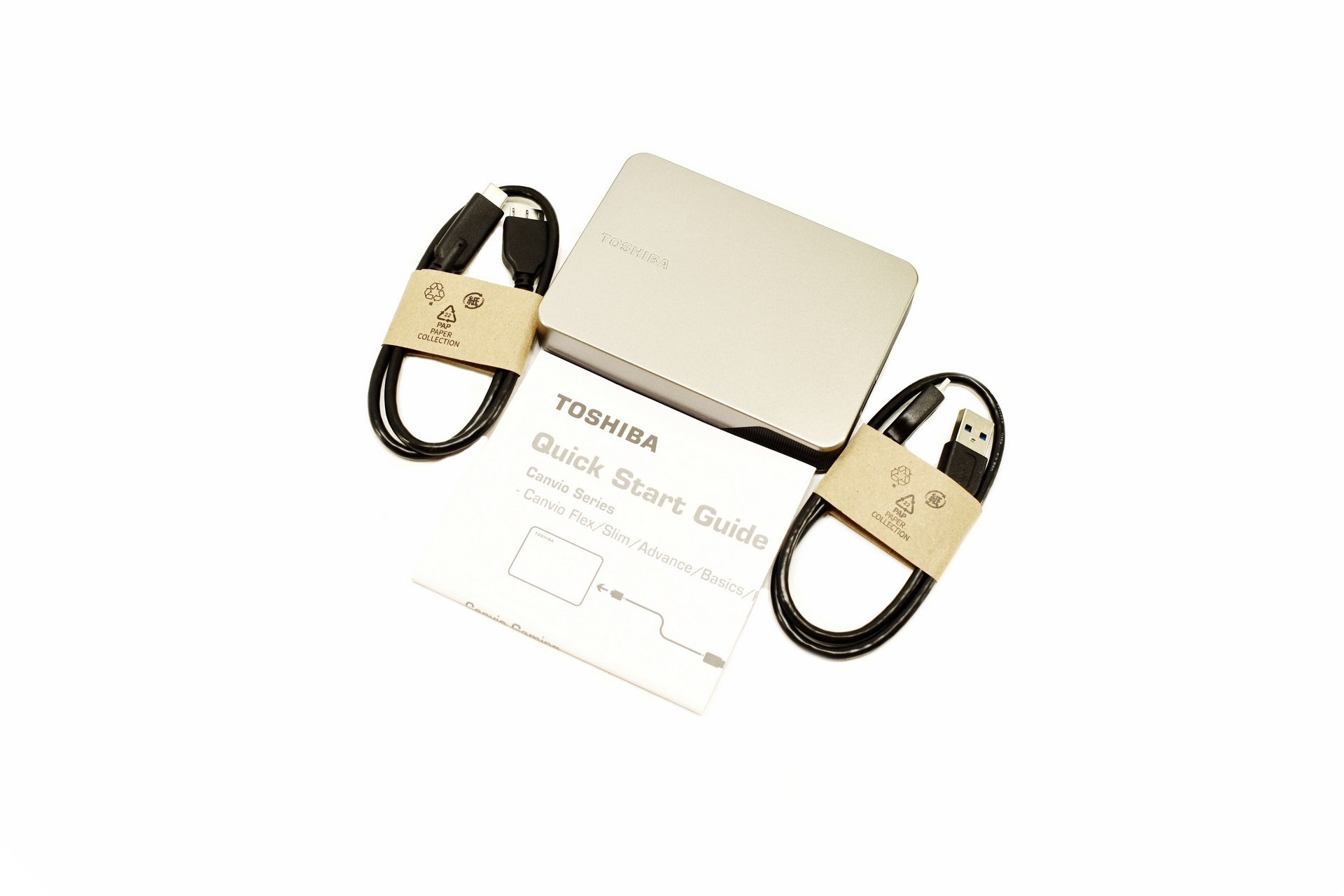 Along with the Canvio Flex inside the box you'll also find a USB-C to Micro-B cable, USB-A to Micro-B cable and the quick start guide.