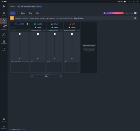 The sonar audio optimization is an important features, however you need to register a free account with SteelSeries to use it. There are 4 main tabs inside the Sonar tab the first of which is mixer which controls the volume across all of them.