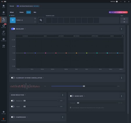 The mic tab is very similar to the chat one so again from here you can access the equalizer function (14 presets), noise cancellation, noise reduction, compressor, and noise gate.