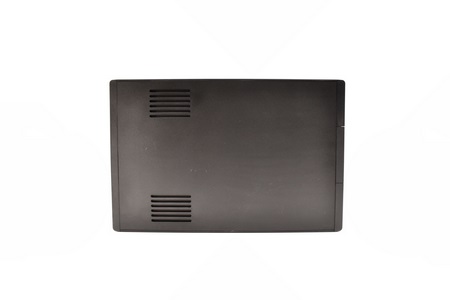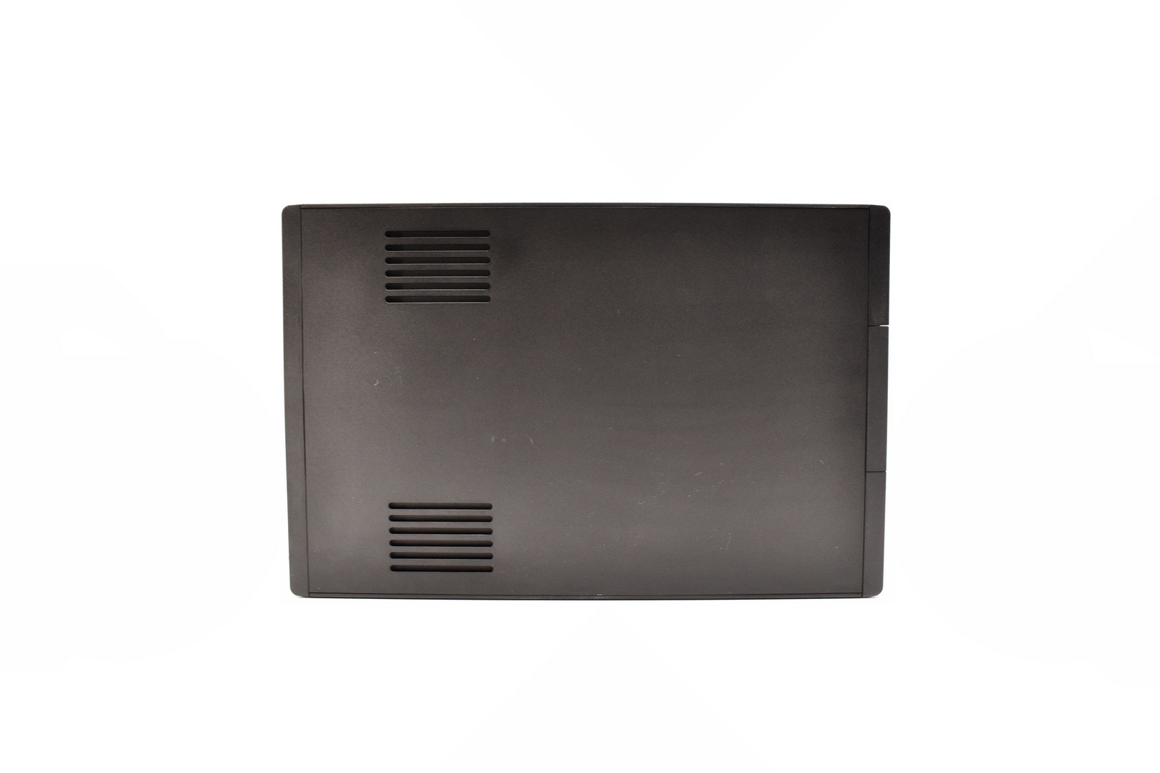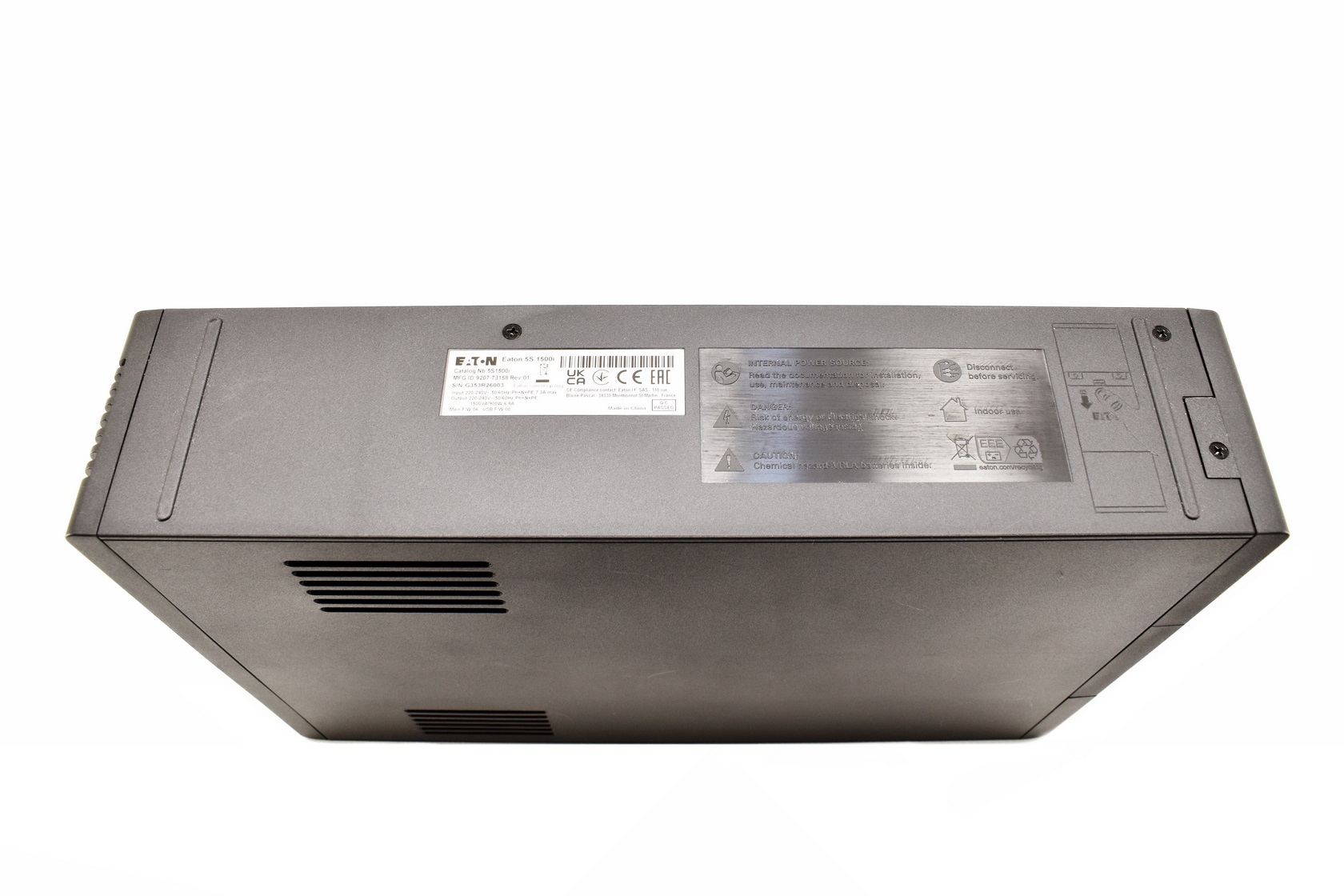 Turning the unit over we find a sticker with the serial number and barcode and instructions on how to access the lead-acid batteries.