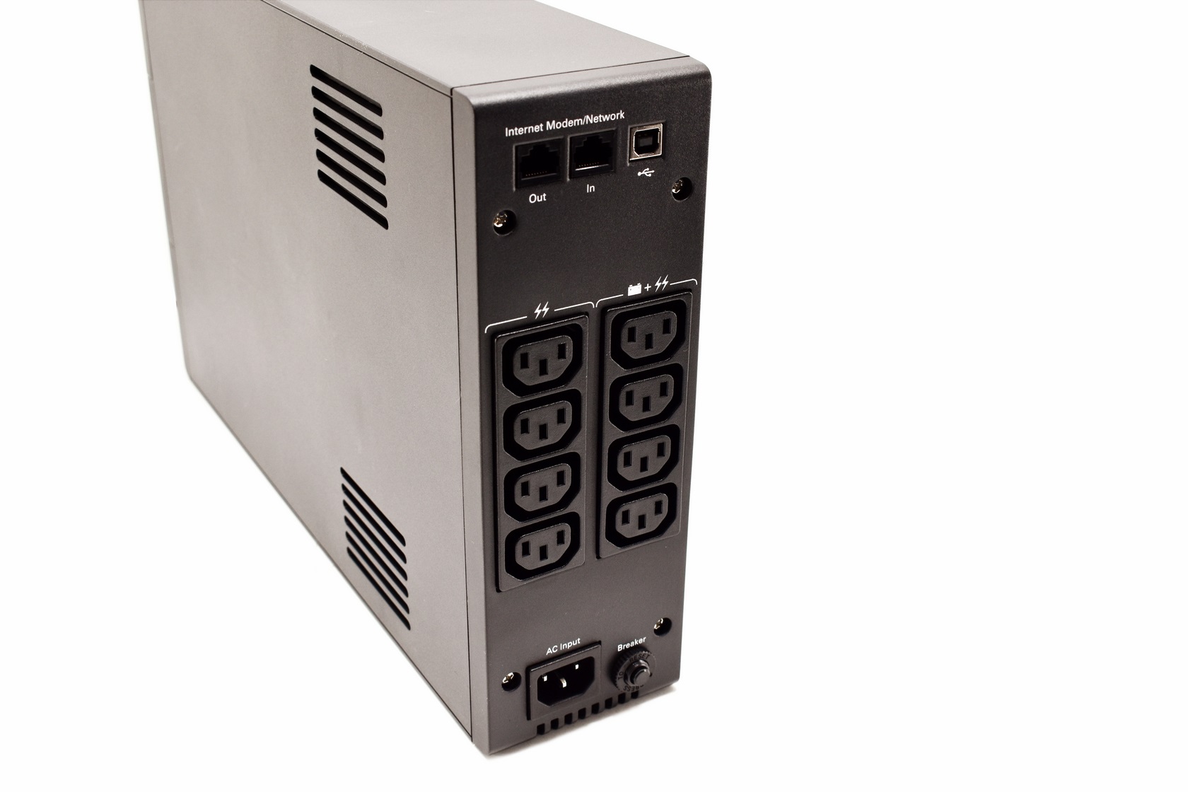 At the rear of the 5S 1500i we find the two RJ11 telephone line ports, USB host port, 8 IEC outlets (left are surge protected while the right ones are battery powered and surge protected), AC input and the breaker button.