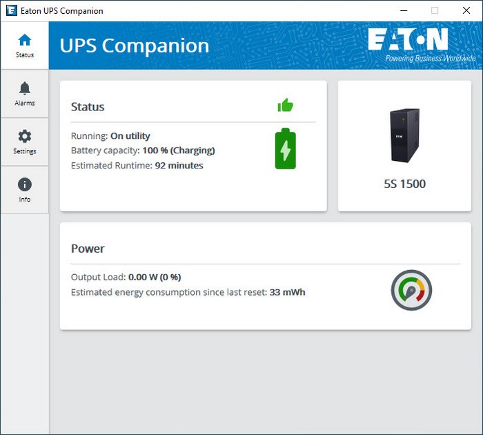 The main tab of the UPS companion software by Eaton lists the UPS model, current battery charge, estimate runtime, output load and estimated energy consumption.