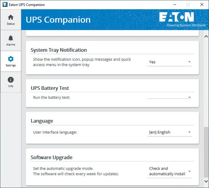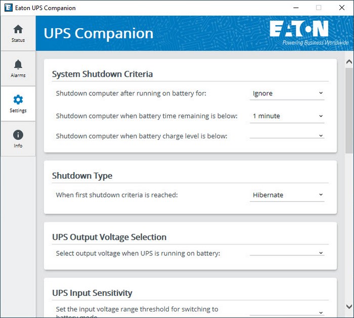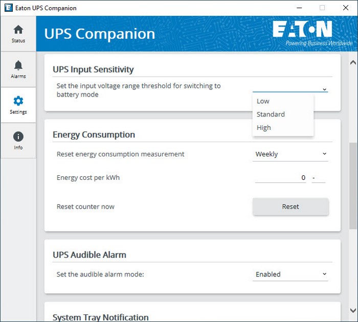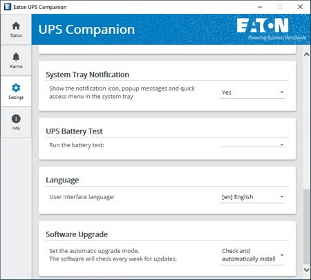 From the settings tab you can adjust shutdown criteria and type, output voltage, sensitivity, energy consumption period, enable/disable audible alarms, test the battery, set battery test intervals and change the language.